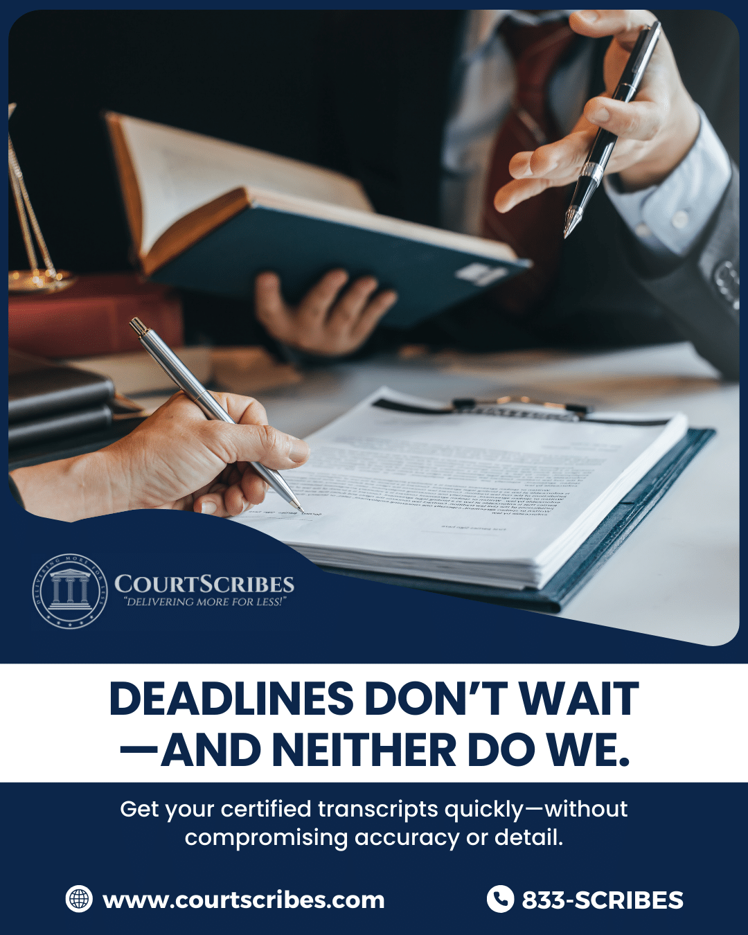 Each legal proceeding receives detailed attention, whether it’s a deposition, hearing, or complex trial. CourtScribes focuses on producing clear, timely, and error-free transcripts so attorneys can concentrate on their legal strategy instead of transcript accuracy. We understand the fast-paced nature of modern litigation and meet those demands with precision and speed.